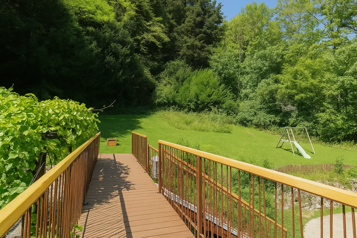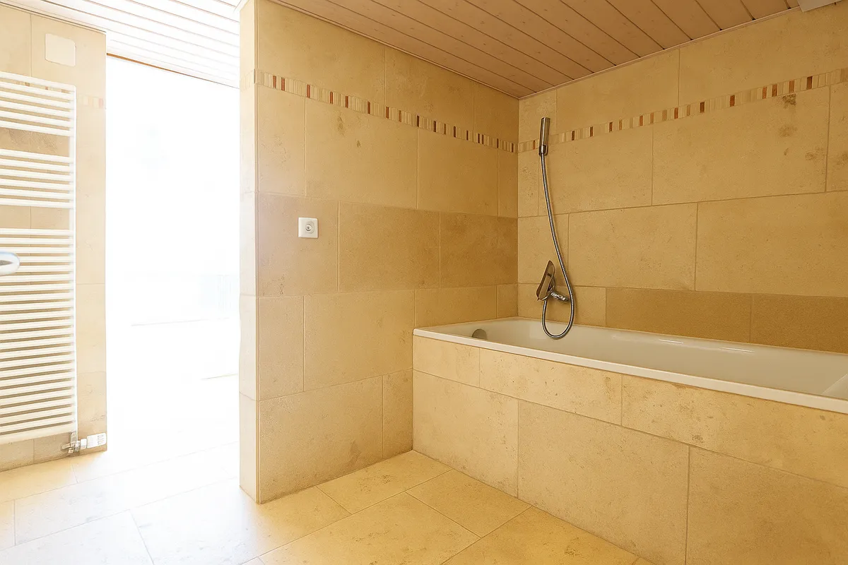 Les matériaux nobles – pierre naturelle, bois massif – rencontrent des équipements récents : pompe à chaleur, électroménager moderne, passerelle neuve. Tout est prêt, rien n’est à attendre.