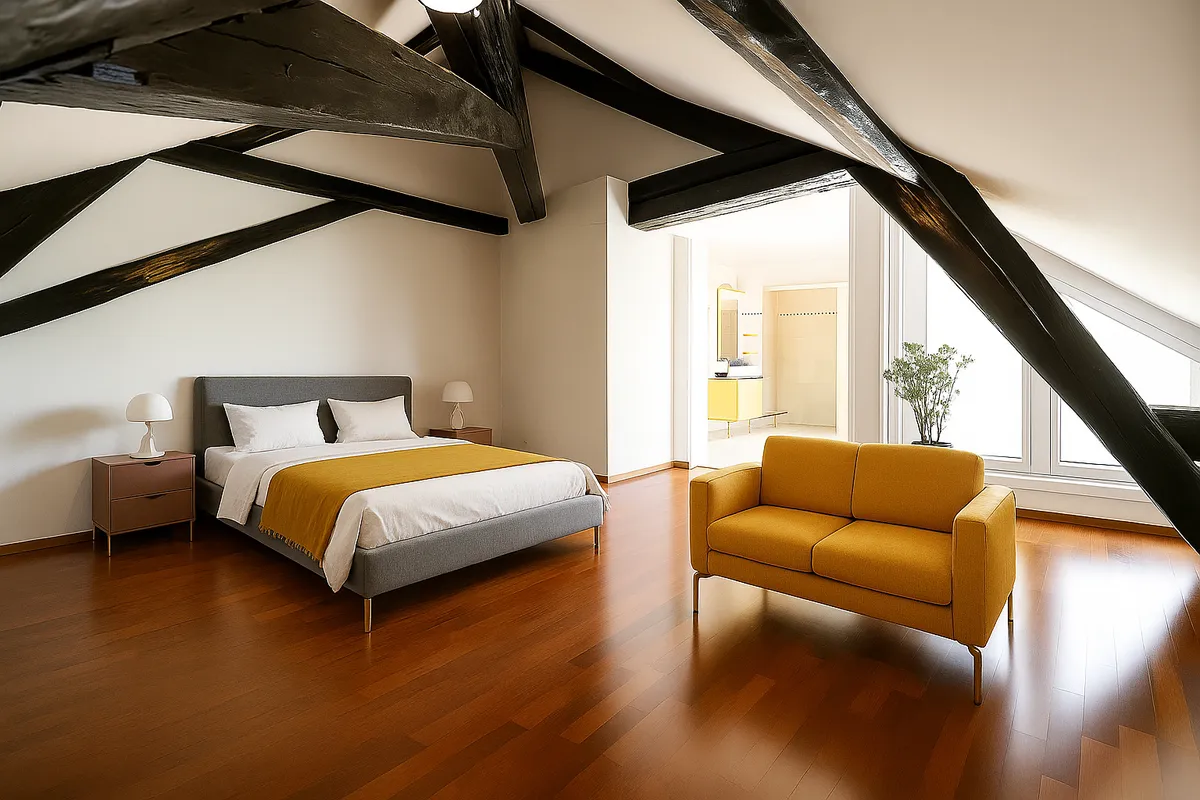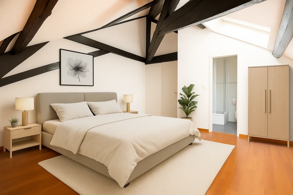 Perchée au sommet d’une bâtisse traditionnelle de 1912 comprenant deux logements, cette maison-terrasse de 8,5 pièces s’ouvre comme une respiration sur la campagne de Vugelles-La Mothe. Ici, le silence de la nature s’invite au quotidien, ponctué par la lumière qui inonde de larges volumes aux lignes intemporelles.